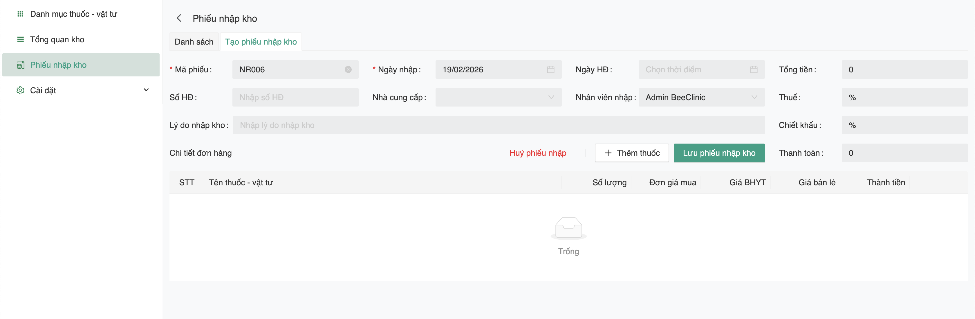 quản lý kho dược phòng khámquản lý vật tư y tếphiếu nhập kho thuốctheo dõi tồn kho theo lôquản lý hạn sử dụng thuốcgiá nhập giá bán thuốc phòng khámphần mềm quản lý kho nâng caokiểm soát tồn kho phòng khámquản lý vật tư y tế bằng phần mềmkích hoạt tính năng BeeClinicLưu phiếu nhập